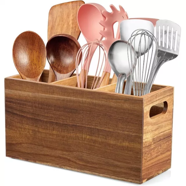 This utensil holder features three adjustable compartments that let you customize the space to fit your needs. From spatulas and ladles to forks, knives, and spoons, everything has its place. The sturdy wooden construction is reusable, durable, and built for everyday use without bending, cracking, or tipping over. Its open-top design makes grabbing the right tool quick and effortless while keeping your counter looking organized.