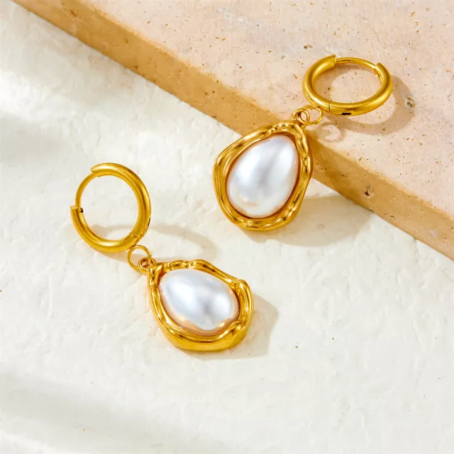 Crafted from 316L stainless steel, these earrings are made to last. The polished golden finish offers a luxurious look, while the durable metal resists fading and tarnishing. The smooth pearl accent brings balance and elegance, creating a statement piece that feels refined yet bold.