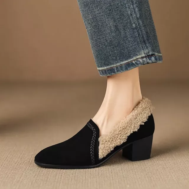 Meet your new winter favorite. These suede high heel loafers are designed for women who want to stay warm without giving up style. With a soft, retro-inspired look and a cozy plush interior, these shoes bring elegance and comfort together in one beautiful pair. The round toe design adds a classic touch, while the elevated heel gives you a confident lift that feels just right for everyday wear.