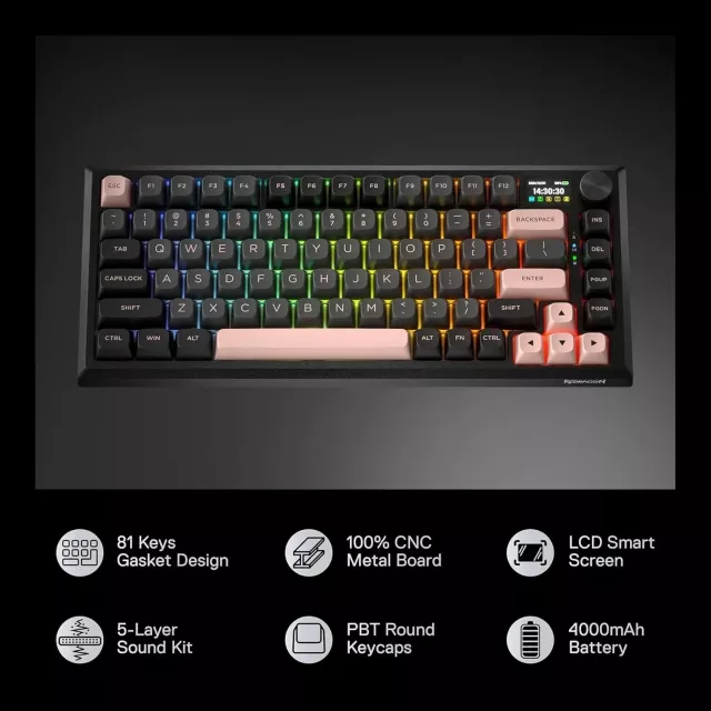 The smart info display keeps you in control, displaying essential stats like battery level, connection mode, and typing status, while the high-quality switches ensure smooth and responsive feedback. With advanced connection options, including USB-C, Bluetooth, and 2.4GHz wireless modes, this keyboard works seamlessly across different devices. Plus, with the intuitive one-knob control, you can easily adjust media settings, backlight brightness, and more without taking your hands off the keys.
