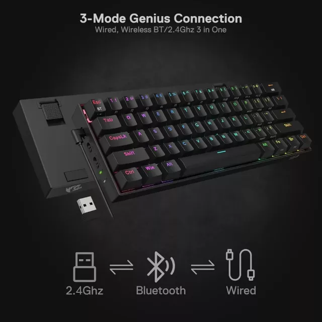 What makes this 60% wireless keyboard special? It’s all about the combination of cutting-edge features, high-end performance, and portability. The compact design allows you to maximize your desk space, ensuring you have room to move your mouse freely without feeling cramped. Whether you’re at home or at an event, this keyboard gives you the flexibility to switch between wireless and wired modes, so you can enjoy smooth, reliable gameplay in any environment.